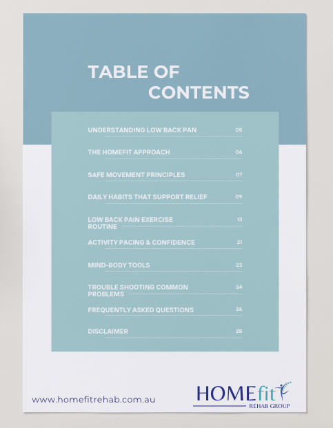 The Low Back Pain Relief Guide by HOMEFIT Rehab Group gives you clear direction, gentle exercises, practical strategies, and supportive education to help you take control of your back health from home.